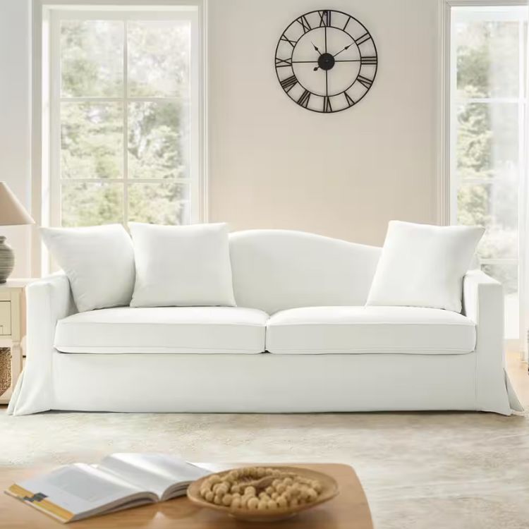 This sofa brings a touch of traditional elegance with its rolled arms and tailored slipcover. It's a great fit for classic or farmhouse interiors.