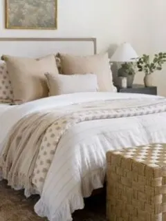 A couple of years ago, I was redecorating our guest bedroom, and because it is such a small bedroom, I knew a pure white color was what it needed. So I selected Ultra Pure White by Behr, and it is the perfect white paint color for this room. It has a soft appearance, and painting the trim and walls the same color made painting super easy.