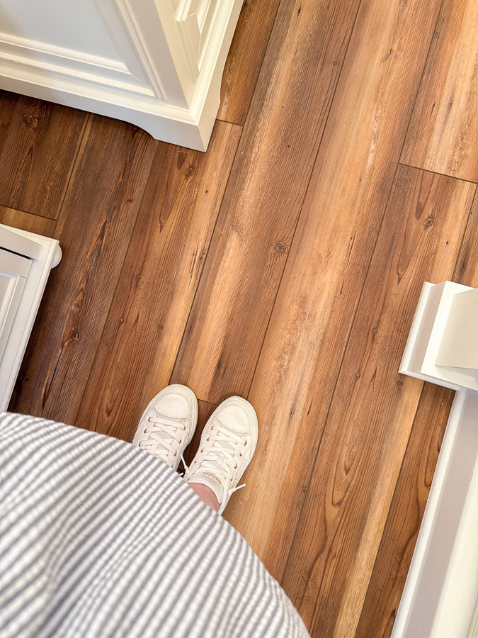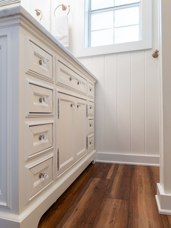 Another element that adds texture is the flooring. The coastal cabin has beautiful old wood floors, but this bathroom had some issues, so we covered it with gorgeous wood. We wanted to leave the old wood below just in case someone in the future wants to use it.