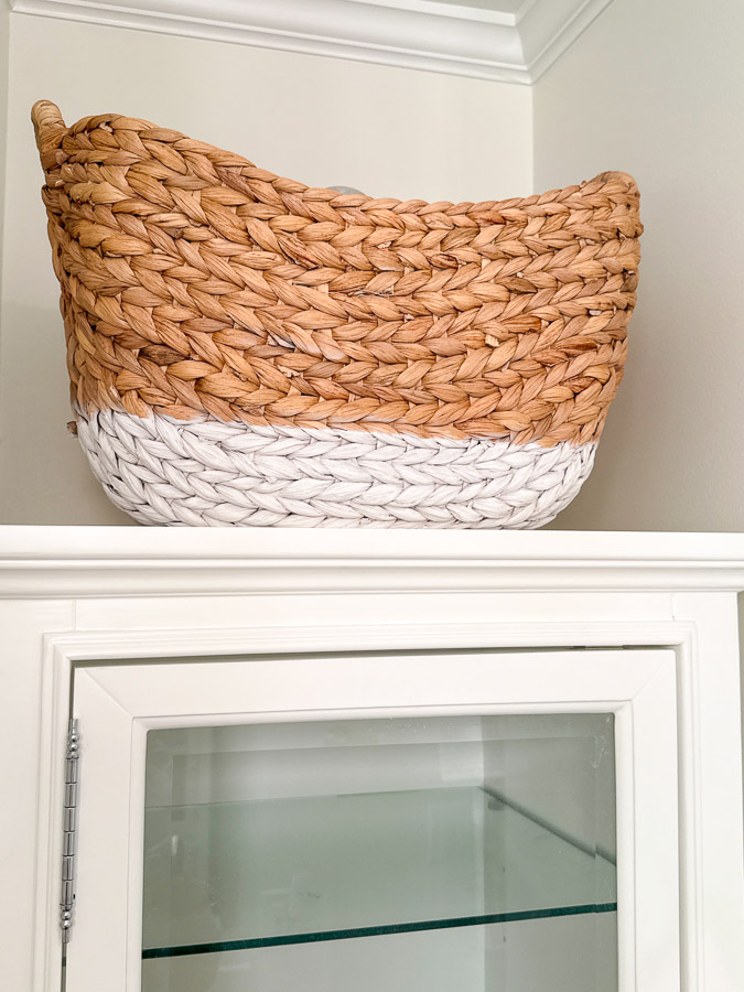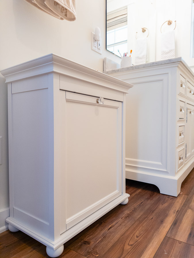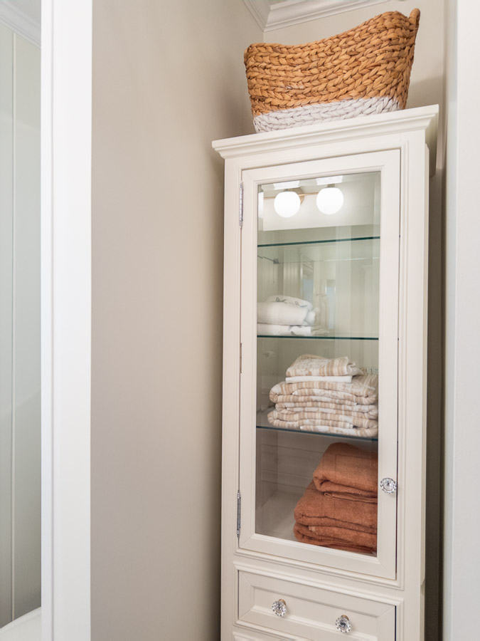 An apothecary cabinet added charm and hidden storage. Now she has a place to store towels and so much more. We added hyacinth baskets to the shelves behind the glass to hide unsightly items.