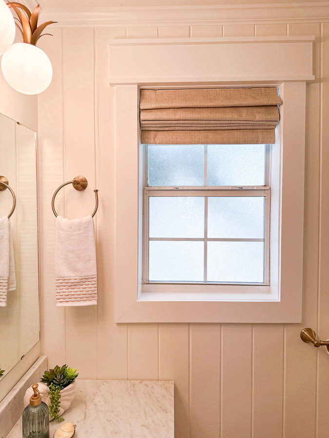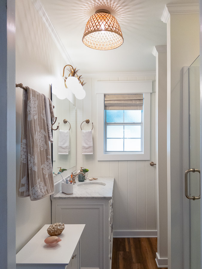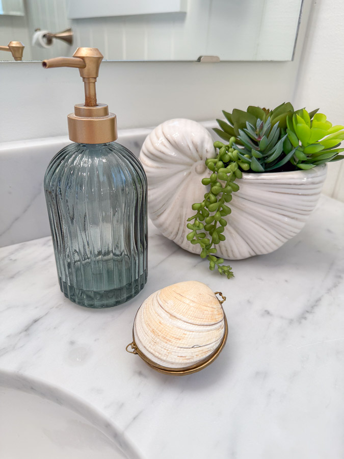 We let the natural light from the frosted window pour in by keeping the shades open all day, making the room feel even bigger and brighter. And, of course, we couldnโt resist a few seashells: a decorative clamshell, a tiny shell planter by the sink, and another on top of the hamper.