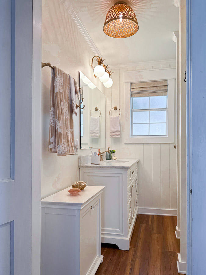 I originally planned a rug with a blue starfish design (which I still adore), but my sister went with a smaller neutral rug that tucks under the vanity when not in use. Honestly? It works beautifully.