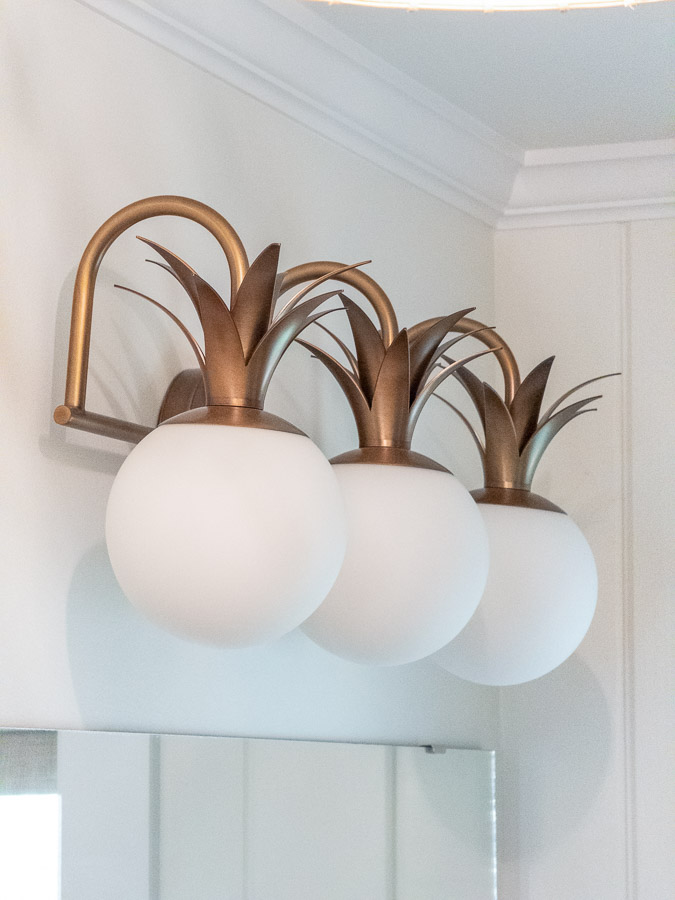 And let's not forget the lighting. Over the vanity is the star of the show โ a three light vanity fixture in brushed gold that looks like pineapple leaves coming from the top.