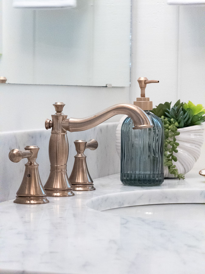 We found the perfect faucets in a champagne bronze finish from Delta that brought a soft glow to the space. There is something about brushed gold that helps bring warmth to an otherwise all white space