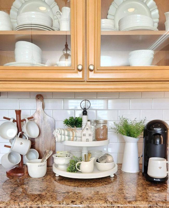 She incorporated a classic farmhouse tiered tray into her station, blending decorative touches with functional pieces. Itโs the perfect way to add charm and coziness to your coffee station!