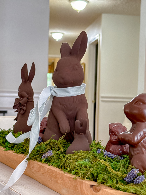 I painted ceramic thrift store and dollar store bunnies to look like real chocolate and placed them in a dough bowl with moss and dried lavender. It’s simple, but it looks like something you would find in a charming little shop.