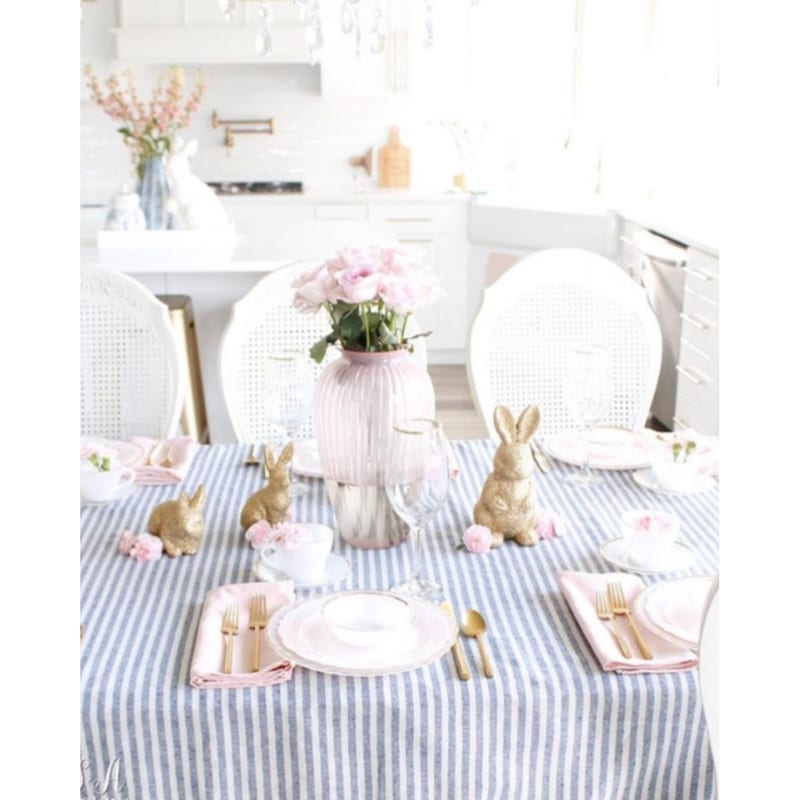 A blue and white striped tablecloth with hints of pink flowers and napkins are all things Spring. The adorable bunnies add the cutest touch to this Easter table. The golden utensils and the glassware make this just a bit of elegant.