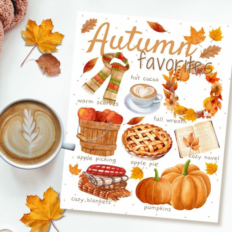 This sweet watercolor printable is all about the little things we love most in fall. Titled Autumn Favorites, it features hand-painted seasonal icons like a cozy scarf, a wreath, hot cocoa, a basket of apples, and more.