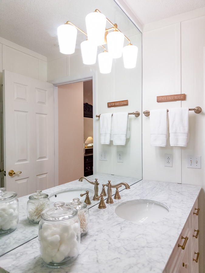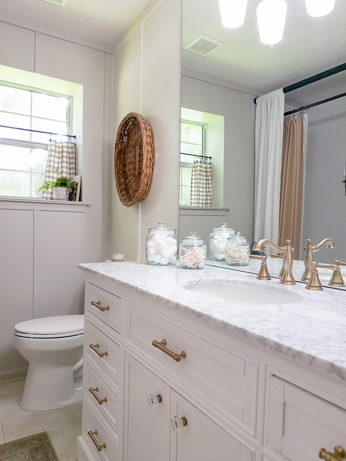 We selected a classic white vanity from Loweโs, featuring a stunning carrera marble top, an undermount sink, and soft-close drawers.