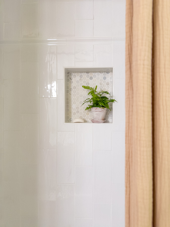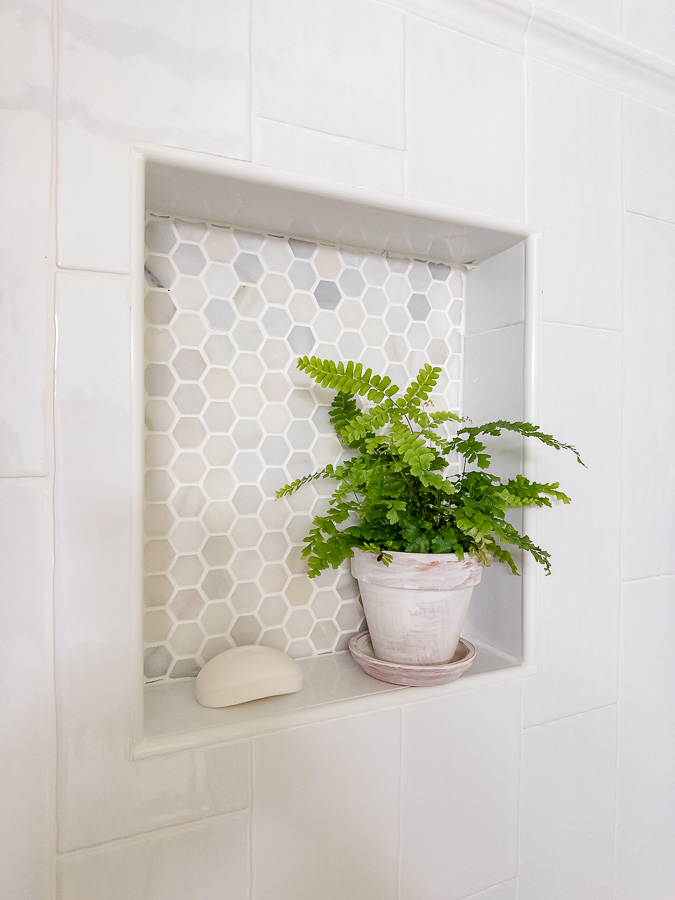 Within the shampoo niche, I incorporated a marble hex tile for a luxurious touch that complements the vanity top.