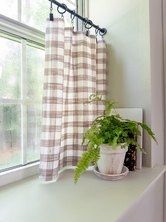 For the window treatment, I used gingham table napkins hung from oil-rubbed bronze rods with ring clips.