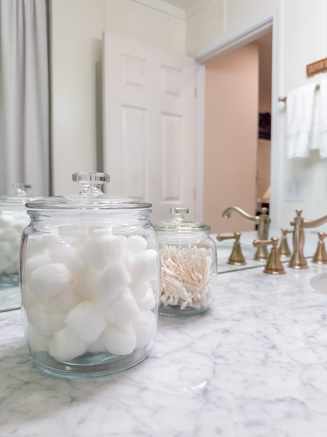 To the side, I styled the countertop with a trio of clear glass canisters for storage filled with Q-tips, cotton balls, and everyday essentials. Pretty and practical, just how I like it.