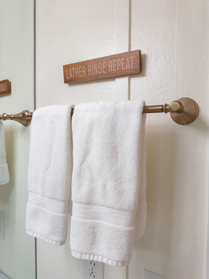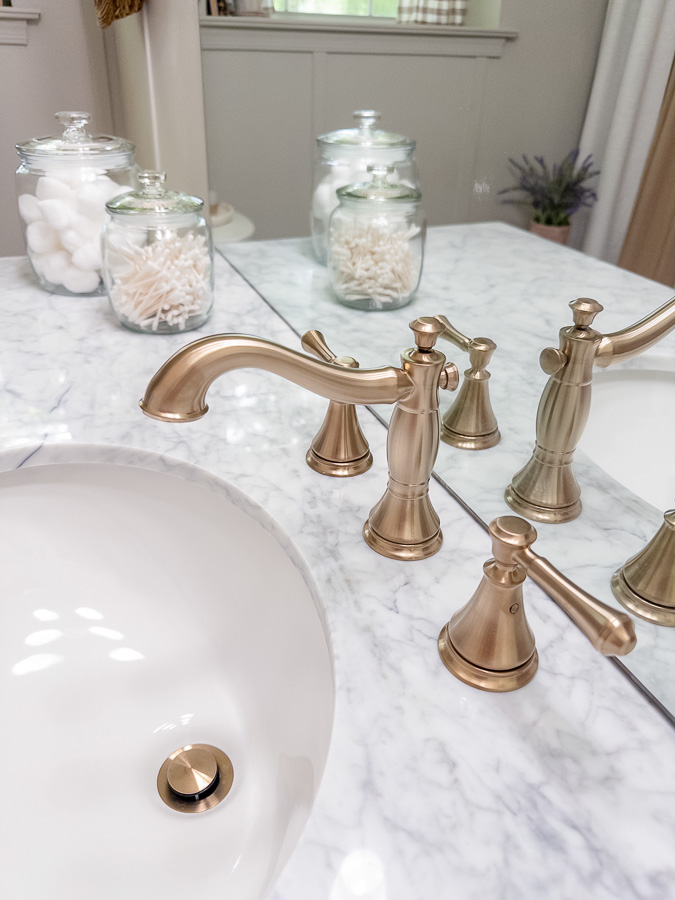 All the fixtures are part of the Delta Cassidy collection from Loweโs, available in champagne bronze, which features an unlacquered brass look that I love. The vanity faucet is widespread with lever handles and a vintage modern charm.