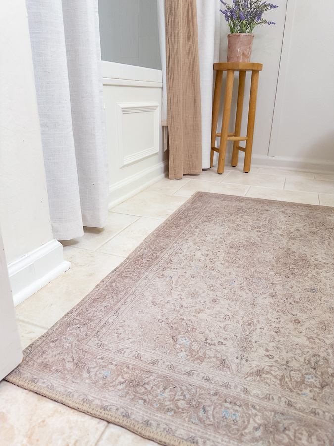 Now for the accessories โ the jewelry of the room! A vintage-style rug from Loweโs adds softness underfoot.