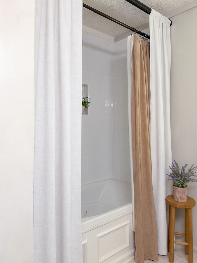 Above the tub are extra-long white linen curtains by Deconovo, cut in half to avoid bulk. And then a shower curtain, also extra long, in a textured tan cotton fabric. These fabrics add natural textures to an otherwise primarily hard-surface space.