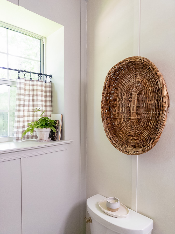 A thrift store basket tray on the wall brings in warmth and natural texture.