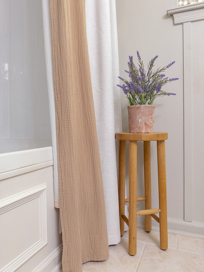 A lavender plant in a whitewashed terracotta pot (painted with chalk paint) sits by the shower.