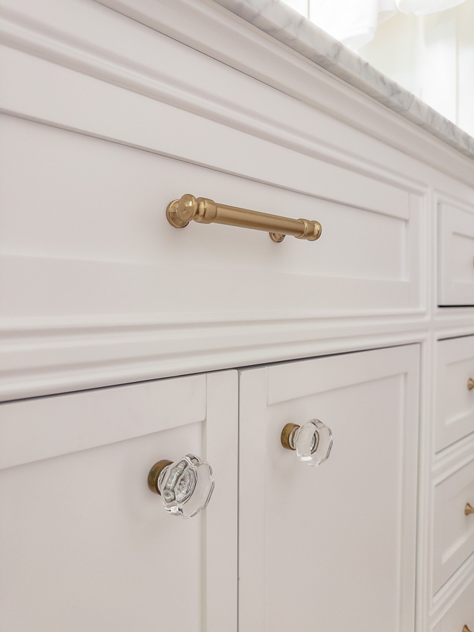 I swapped out the original chrome hardware for champagne bronze pulls on the drawers and reused the crystal knobs from our old cabinet doors. That mix of sparkle and warmth adds the perfect French touch.