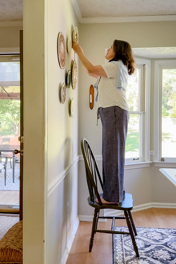 Hanging Tip: If you prefer a plan, cut out paper circles the size of your plates, label them (like โgreen plateโ or โbrown scene plateโ), and tape them to the wall. Rearrange until you like the layout, then hang your plates using those as a guide.