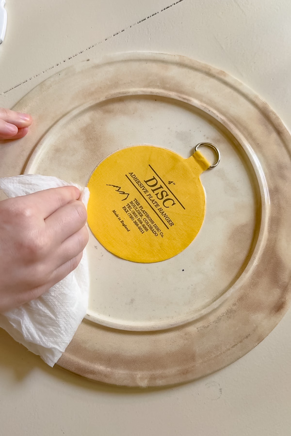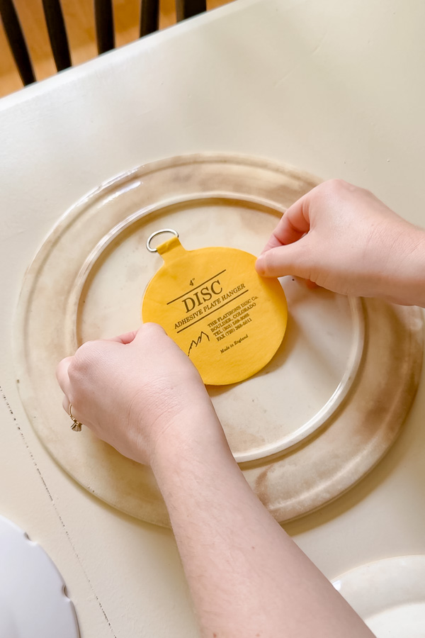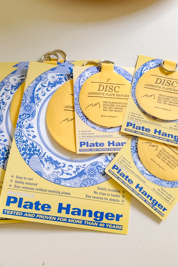 We used invisible plate hangers called adhesive DISCS. These are perfect for keeping your hangers hidden so the plates look like theyโre floating.