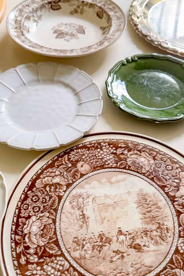 Savanna chose warm browns, soft greens, and creamy white vintage plates. Some were ironstone, others were china, and a few had delicate patterns that added charm. You can do the same with: