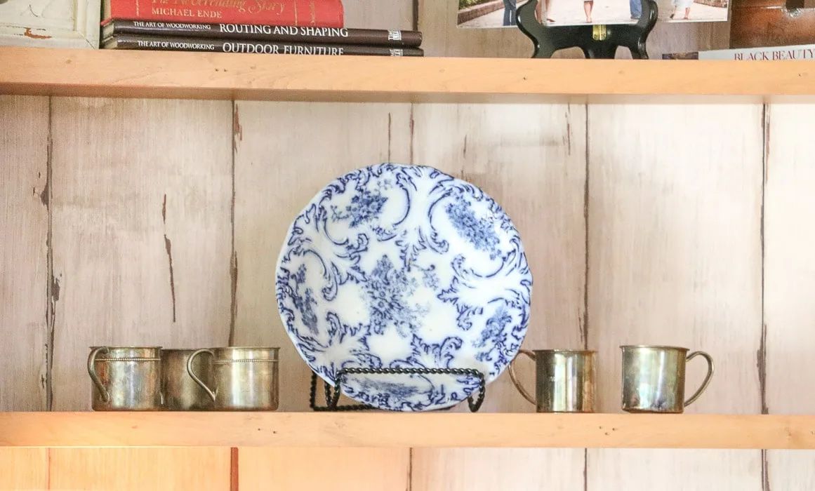 This is a great time to do a bookcase makeover on the back of your bookcase as Susan did with these rustic farmhouse style boards. For more information on this shelf, background DIY check out this bookcase makeover post.