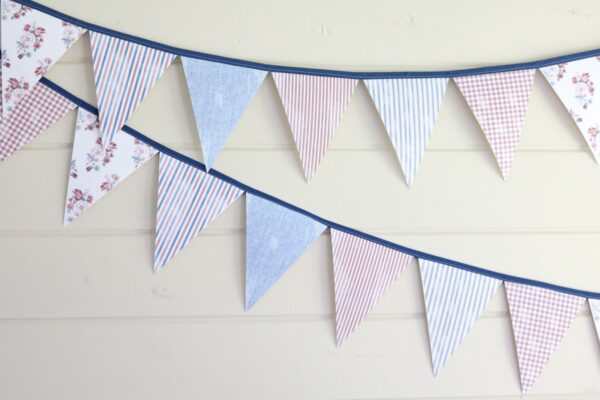 This DIY pennant banner will add a sweet, classic look to your seasonal decor, patriotic decor, parties, or anywhere in your home. The vintage fabric design printed on paper is a small floral pattern, gingham, chambray denim, and ticking stripe.