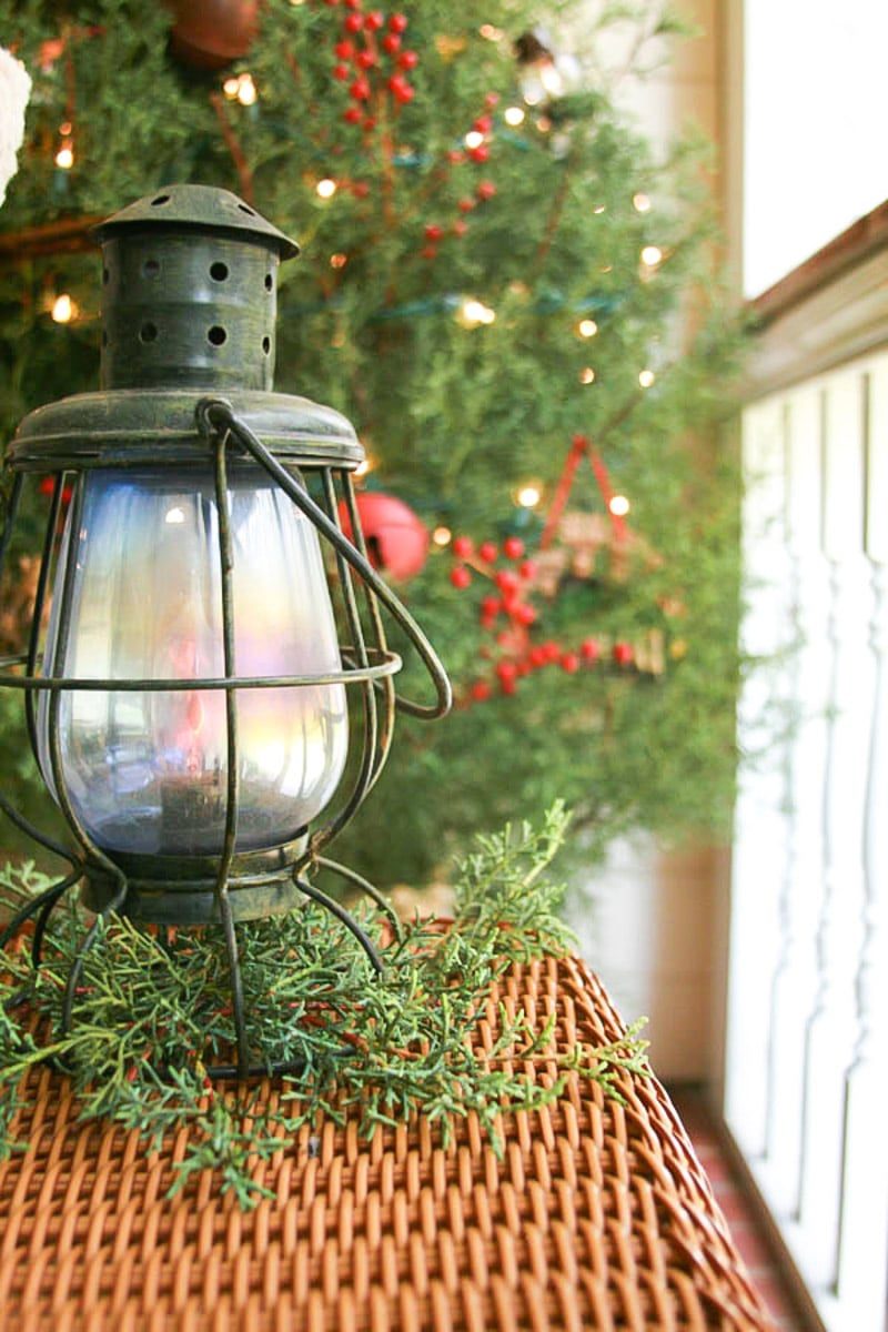 One of my favorite places to decorate in a primitive style for Christmas is on our back porch. Our tree is decorated with things of nature — birds, rusted jingle bells and berries to name a few.