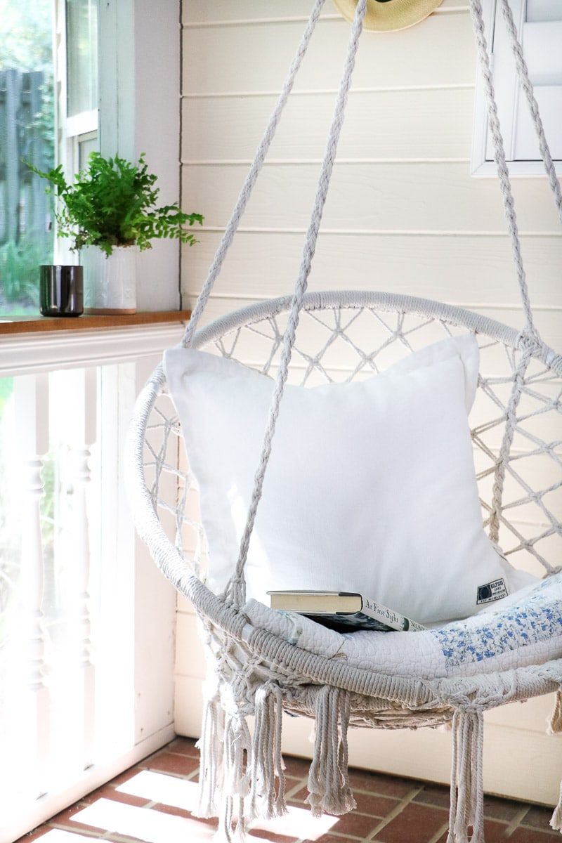 If you have a back porch whether screened in or not consider adding a hanging chair and creating a cozy space for reading on a beautiful day.