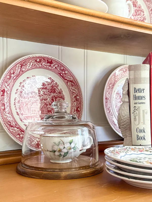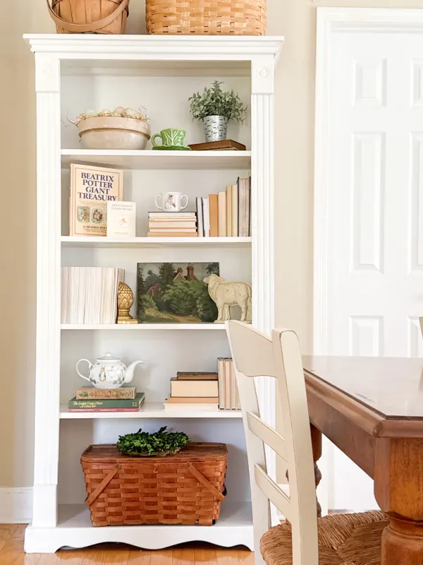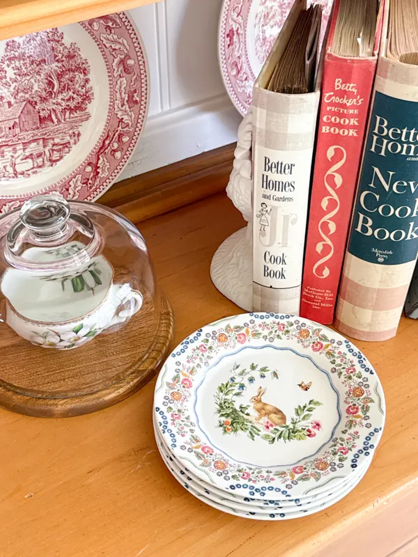 In my dining room bookcases, I leaned into one of my favorite vintage spring decor ideas, the beauty of vintage dishware with a mix of cabbage ware, Peter Rabbit pieces, and delicate spring florals.