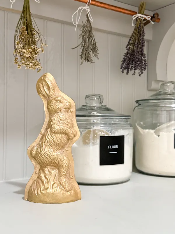 In the butlerโs pantry, I added a candy mold from Michaelโs in the prettiest champagne gold color. This vintage-inspired piece features an anthropomorphic bunny, adding a playful but elegant detail.