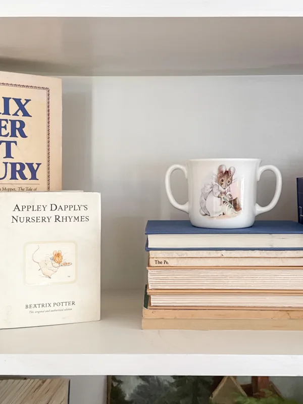 On the next shelf are a few old Potter books used as decorations and a kid's china cup featuring an illustration from one of Beatrix Potter's books.