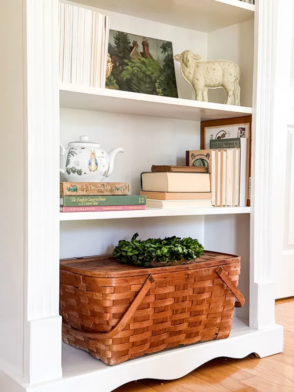 Another new Peter Rabbit teapot on the next shelf and a vintage picnic basket with greenery wreath sitting on it completes the vintage spring decorating on this bookcase.