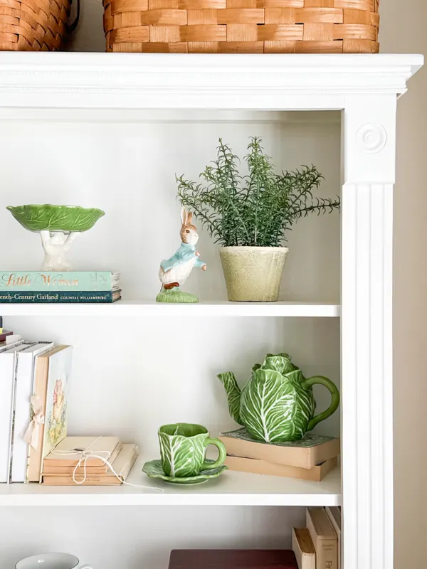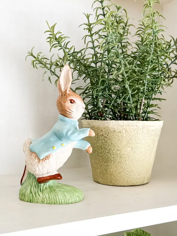 On the first two shelves, I displayed a rosemary plant,ย Peter Rabbit figurine,ย and a bunny holding aย cabbage plate,ย which comes from the vintage collection at Target.