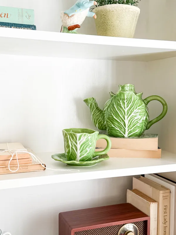 The next shelf is a new cabbage ware teapot and cup from Target nestled on a stack of vintage books.
