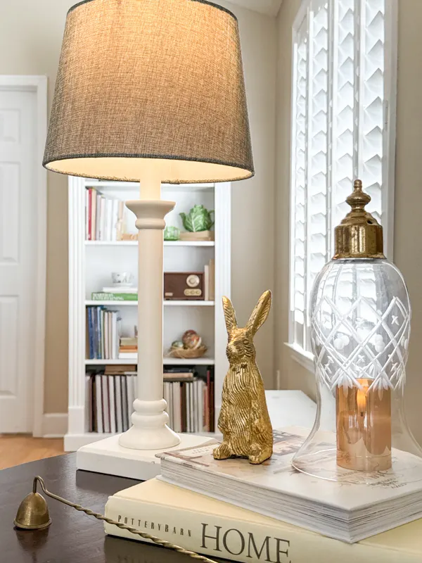 The other end table combines books, and thrift store finds, another cloche with a candle inside, and a bunny. All items are year-round pieces, but adding the distressed gold bunny gave it that vintage spring aesthetic.