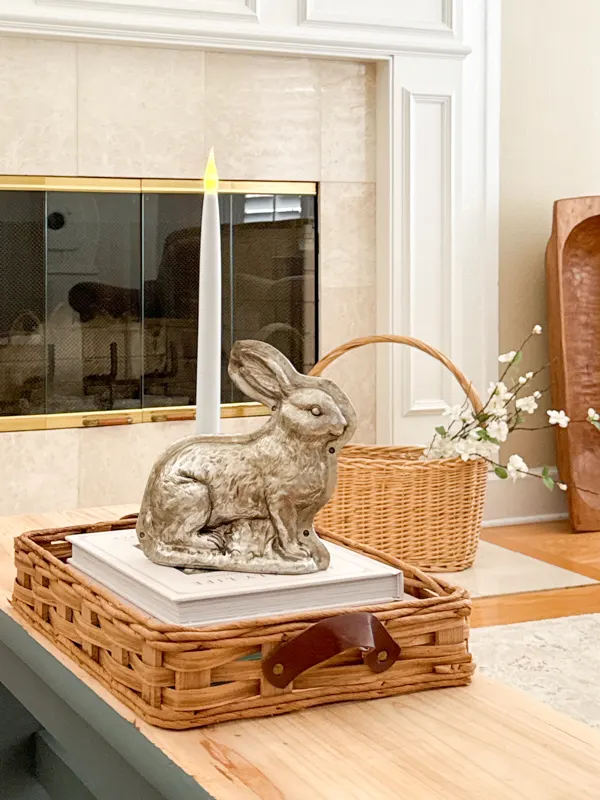 Next to the tray, I placed Studio McGeeโs antique brass bunny perched on a woven Easter basket for a subtle holiday nod.