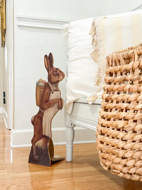 In the kitchen sitting nook, I made a few simple swaps that transformed the space for spring. A new watercolor bunny print takes center stage, bringing in soft pastel hues.