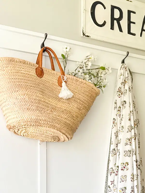 Organic textures are perfect for spring. One of my favorite new findsโa block print tableclothโhangs from a hook, adding a vintage textile moment.